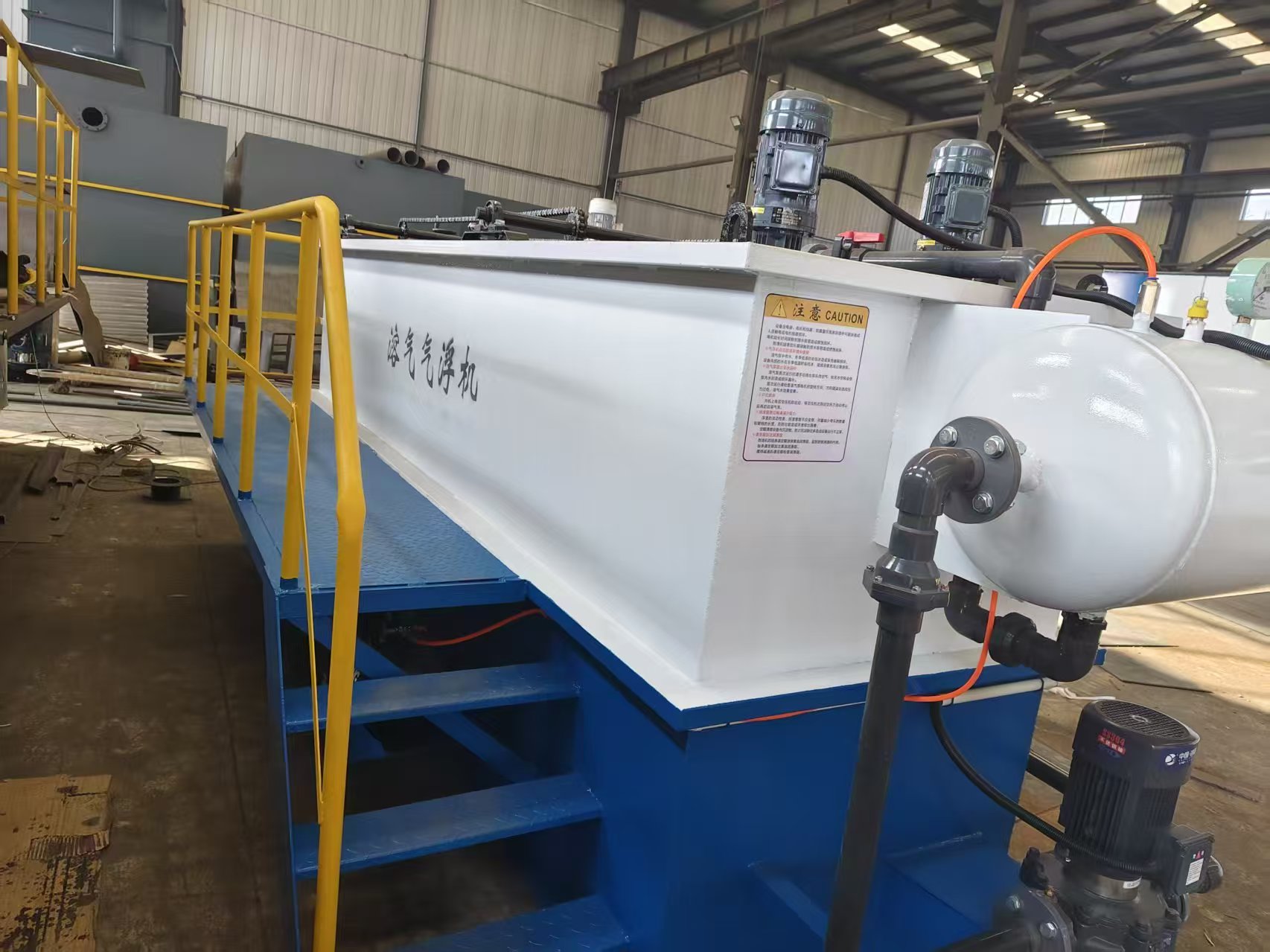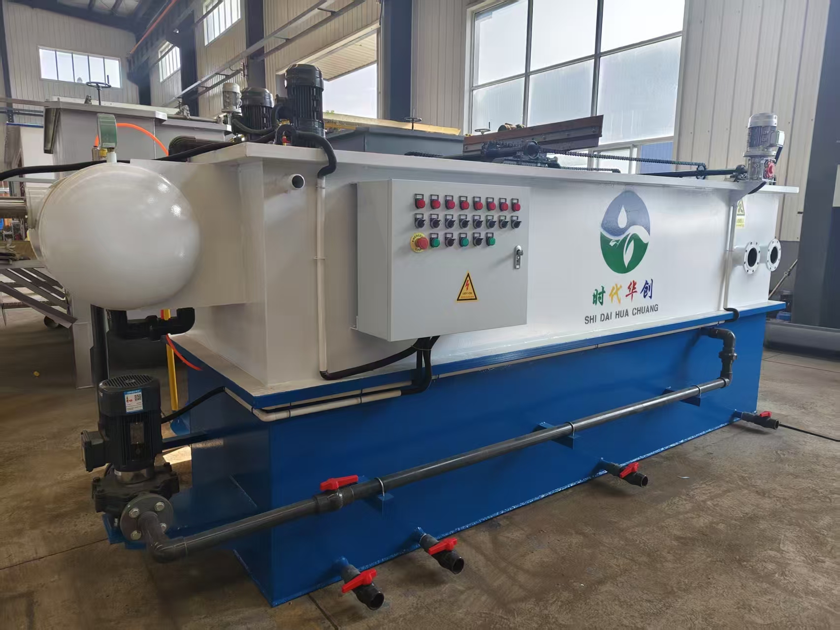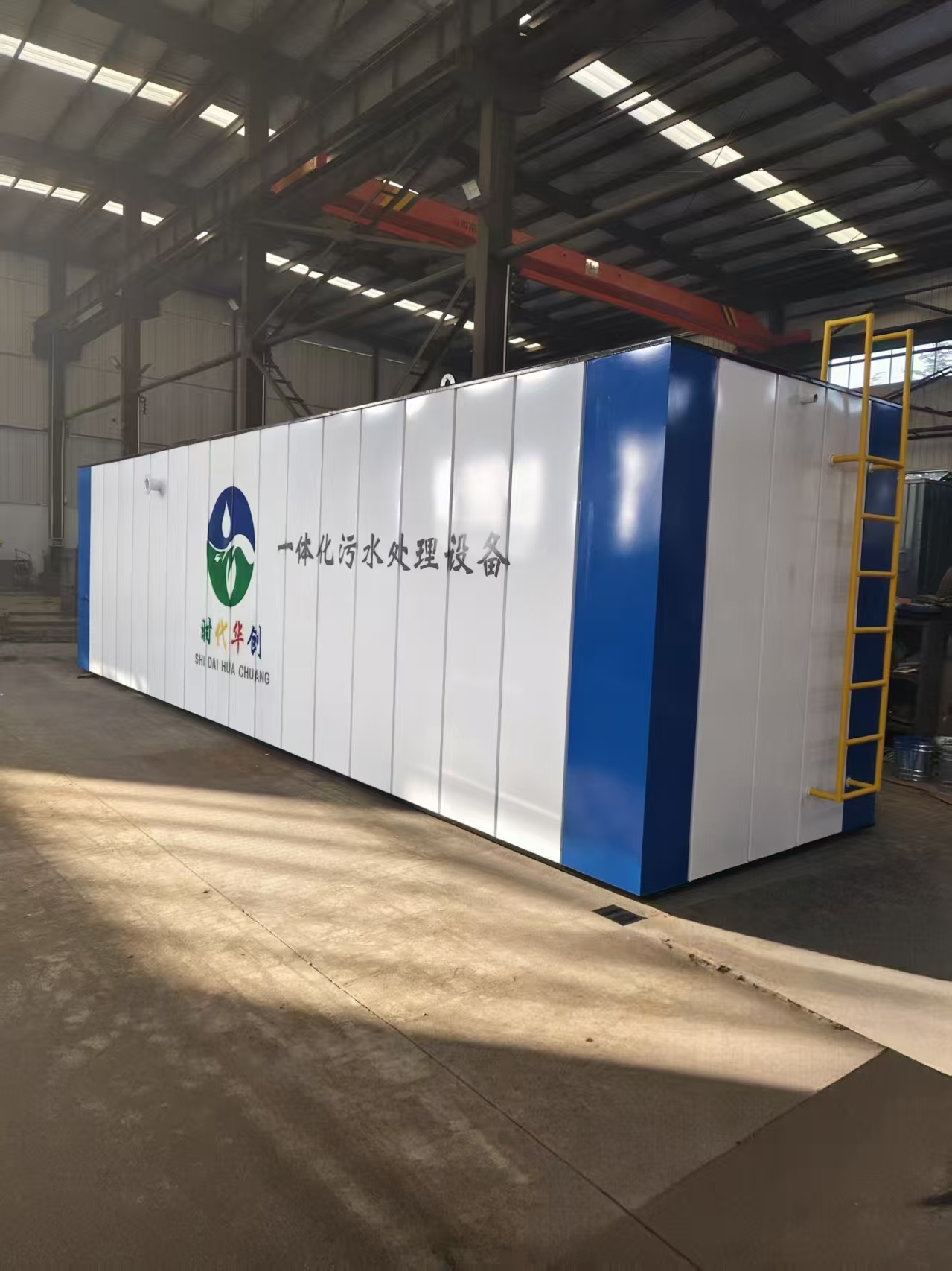 再生水装置有五大单元组成 (1)前端处理池 (2)MBR生化反应池 (3)污泥池 (4)清水消毒池 (5)设备间 先分别就各单元进行说明: (1)前端处理池:本装置的前端处理池为缺氧池。缺氧池一侧设置有进水口,另一侧上部设置有堰水槽和出水口,可以使污水稳定的自然流入膜生物反应池,池内填充漂浮球填料和缺氧污泥,污水在缺氧池内的HRT为3—8h,通过间歇式给予氧份,有效进行酸化、硝化、反硝化作用,使有机物逐渐转化为无机物而被降解去除。缺氧池顶开设人孔并设置钢制直爬梯,便于操作检修。 (2)MBR生化反应池:其一侧设置有进水口,反应池内设置有浸没式平板膜组件,容纳有活性污泥,周边曝气和膜片曝气管路与风机联通,膜组件上配套的集水管与抽吸泵联通,待处理的污水通过进水口进入MBR生化反应池,污水在反应池内的HRT为5h。经反应池内的活性污泥降解后,通过抗污染平板膜组件,然后由抽吸泵吸出进入清水消毒池。反应池内还设置有污泥提升泵,可以把多余污泥提升到污泥消化池内;反应池上部开有溢流口,可以使污水自流到箱外调节池;下部一侧开排空口,便于池内结构维护、清理。 (3)污泥池:污泥池底部设置集泥斗,并设置集泥管,便于污泥集中,上部设堰水槽以利于上清液回流至MBR池,底部开有排泥口,依靠静压自动排泥; (4)清水消毒池:清水消毒池上部设有溢流排水口,消毒池的消毒措施采用安全的物理性消毒法,利用活性离子材料释放的烃基作用,使水质进一步得到净化,同时能与水中的重金属反应而沉淀被移出水体; (5)设备间:设备操作间内置风机两台,分气缸一个,两台风机运行12h自动切换一次,风机设有消音减震措施;设备间四周墙壁和通风口装有吸音防震材料;通风设有空气滤清器以增加风机寿命。抽吸泵两台;根据客户要求,是否设置远程变频供水系统(所述变频供水系统包括:供水泵、衡压罐等);PLC控制柜一台,照明系统;设备间前端开一扇门,顶部设有防雨进气口和通风对流装置。 以上单元集成设置在一箱体内,有电控柜PLC自动控制各动力设备的运行。 再生水装置的选用 1、在选用再生水装置以前,首先必须要搞清污水的性质,进水的水质、水量及要求的达到的处理效果或标准。处理特种工业废水,污水的pH值必须控制在6.8-9,污水中不得有妨碍微生物生长的过量元素,同时必须对其可生化性进行评估,且工程必须在进行小试或中试试验后方可立项上马。 2、调节池由用户提供或构筑,一般为混凝土池体,调节池的容量必须根据排水周期、生产工艺等因素来确定,一般调节池的容量为处理水量的4—10倍。 3、再生水装置设计为立式(LS)和浅埋式(QS)两种型号,根据用户需要可放置在地面上,也可部分浅埋于地表以下。整套装置为工厂预制,运到现场接通水电调试后即可作业,无需进行二次施工。 4、该设备如用在寒冷地区,冬天需进行防冻处理以保证设备的正常运行。 五、外形结构及技术参数 型号 项目 | 处理水量 m3/h(m3/d) | 外形尺寸 长x宽x高(mm) | 占地面积 (m3) | 运行功率(KW) | HCW-2 | 2 (50) | 3400x2000x2500 | 4.0 | ≤3.0 | HCW-4 | 4 (100) | 4800x2000x2500 | 6.8 | ≤6.0 | HCW-6 | 6 (150) | 5500x2000x2500 | 9.6 | ≤7.0 | HCW-8 | 8 (200) | 5600x2500x2500 | 14.0 | ≤8.0 | HCW-10 | 10 (240) | 5600x3000x2500 | 16.8 | ≤9.0 |